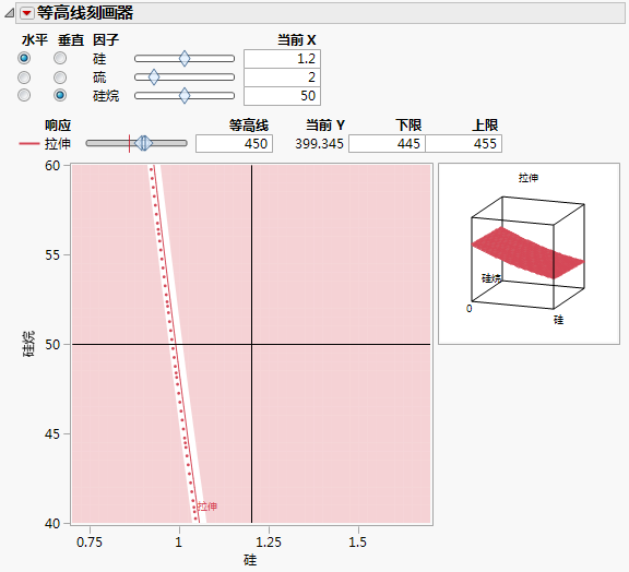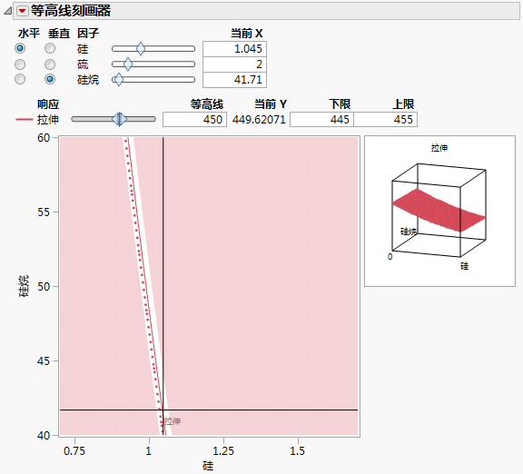 点击“响应拉伸”红色小三角菜单并选择因子刻画 > 等高线刻画器。假定您要在将硫磺设置为值 2.0 时实现目标。此外,您要确保您为硅烷和硅石选择的设置可让预测的拉伸值保持在 450 附近的 5 个单位之内。