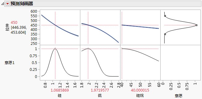 您最大化意愿函数时,JMP 确定一个因子水平设置组合(通常来自很多可能的组合),该组合可实现预测的拉伸值 450。图 11.8显示这些设置为:硅石 = 1.069,硫磺 = 1.972 且硅烷 = 40.000。接着,您使用等高线刻画器确定最大化意愿函数的其他点。