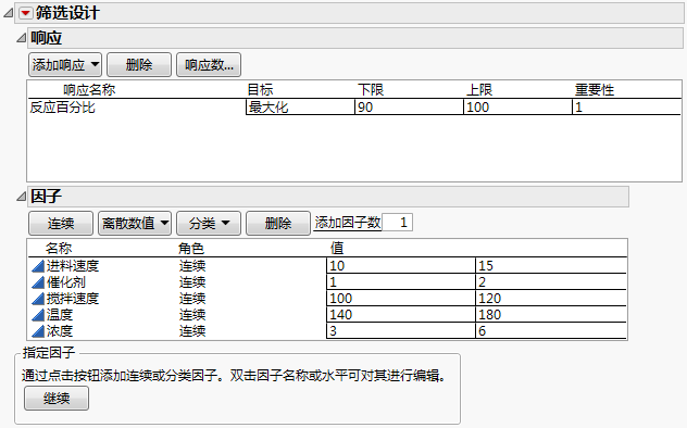要自动输入因子,请使用 Reactor Factors.jmp 数据表: