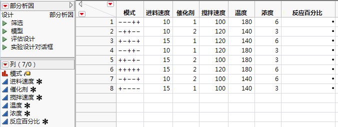 默认生成规则为您提供完全析因设计的标准(或主)四分之一部分。回想一下,您怀疑催化剂*温度和搅拌速度*浓度交互作用不太可能活跃。重新定义生成规则以便这两个交互作用与进料速度混杂。重新定义的生成规则为您提供完全析因设计的另一四分之一部分。