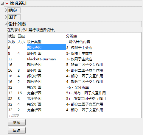 该设计表显示您构造的设计。请注意,该表包含您在“筛选”窗口中定义的响应反应百分比的列,您可以在此记录实验结果。