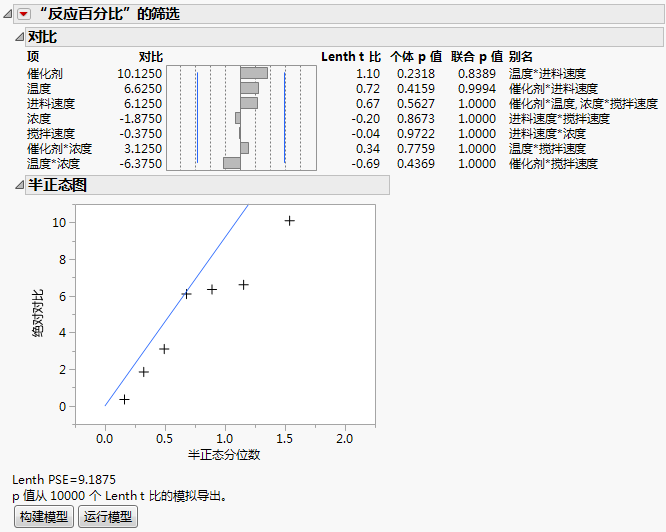 下例改编自 Meyer, et al. (1996),其中显示了如何在您有许多因子的情况下使用“筛选设计”平台。在该示例中,一位化学工程师要调查五个因子对于某化学反应过程的反应百分比的效应。这些因子包括: