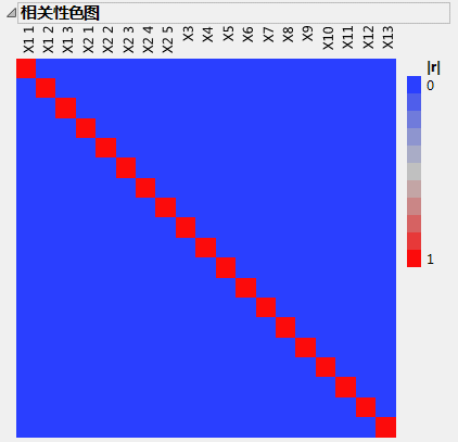 色图(图 9.10)在主对角线上显示红色条目(使用 JMP 默认颜色),这指示相关性为 1。这是因为每个对角单元格对应于项与自身的相关性,而这是 1。非对角相关性都是深蓝色,这指示非重复项之间的相关性为 0。在任意单元格上方停留鼠标指针,以查看相关项和它们的绝对相关性。