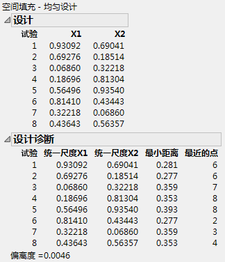 图 21.14 具有 8 次试验的均匀空间填充设计的因子设置和诊断
