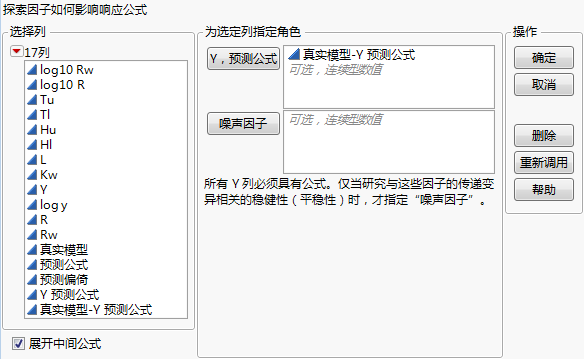 真实模型通常无法在简单解析表达式中提供。因此,仅知道观测的数据点处的预测偏倚。但是,在本示例中,真实模型的函数形式是已知的。在 Borehole Sphere Packing.jmp 数据表中,真实模型列包含已知函数的公式。通过该公式,您可以刻画因子输入区域上的预测偏倚。