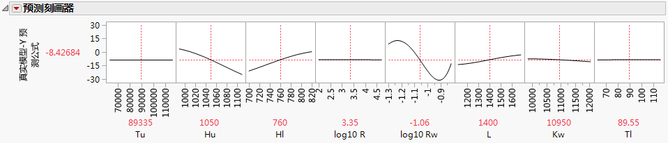 您可以使用刻画器探索整个域上预测偏倚的范围。要找到最小和最大偏倚点,请从“预测刻画器”红色小三角菜单中选择最优化和意愿 > 意愿函数。请参见《刻画器指南》手册中的“意愿刻画和优化”。要评估设计点上的预测偏倚,请选择分析 > 分布来查看分布分析。