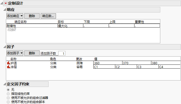 “因子”分级显示项在不同平台中各有不同。这是为了适应每个平台所处理的不同类型因子和特定设计情形的需要。在某些平台中,一旦输入响应和因子,点击“继续”后即显示“定义因子约束”分级显示项。在该分级显示项中,您可以限制可用于设计的因子值。