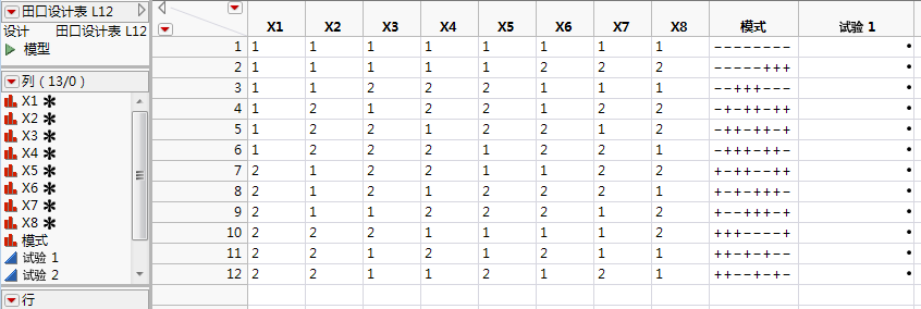 变量的值中,加号代表高水平,减号代表低水平。在该表中,每个因子对应一列,“模式”列中显示的每个模式对应一列。模式列包含实验响应。若选定“田口设计”红色小三角菜单中的“模拟响应”,模式列将填充模拟的响应值。