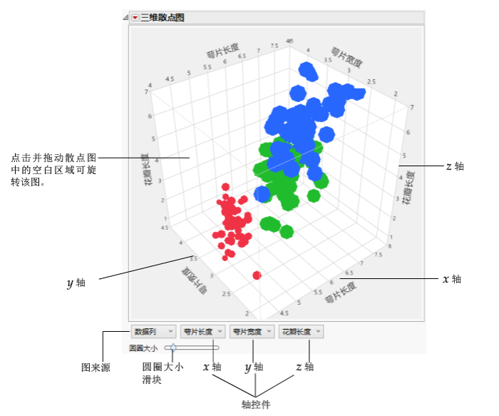 “三维散点图”报表显示数据的三维可旋转视图。请参见