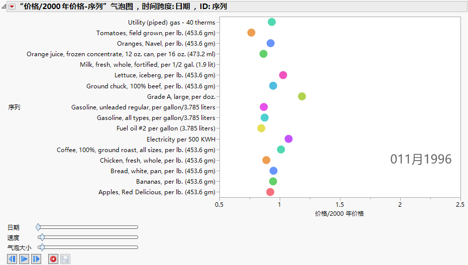 该示例使用 blsPriceData.jmp 样本数据表,其中显示若干年间的商品价格。由于美元币值随时间变动,名为“价格/2000 年价格”的列显示任意给定时间的商品价格与 2000 年的价格之比。