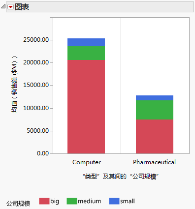 若有两个 X 水平和一个 Y 变量,可通过选择平台菜单中的堆叠条命令堆叠这些直条。