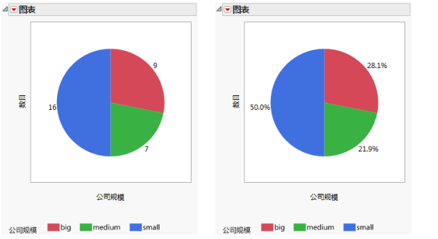 图 14.17 饼图标签的示例:值(左图)和百分比(右图)