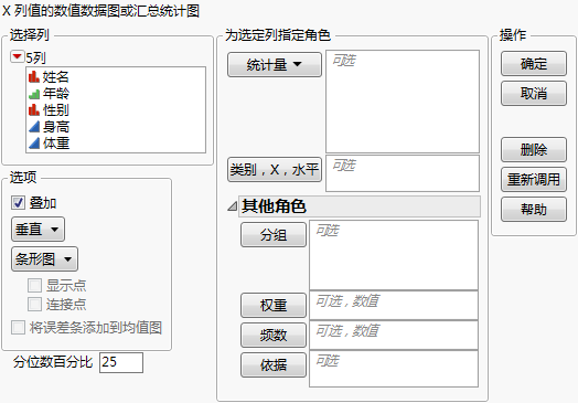任意数量的 Y 变量(统计量)。若数据已经汇总,则将数据选作统计量选项。