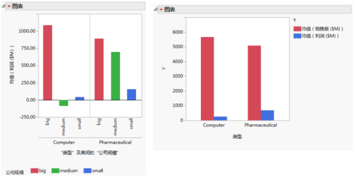 图例按需显示。若您的图表使用不同的颜色或标记显示一个或两个 X 变量的水平,则图表下方的图例会将其显示出来。若您的图表使用不同的颜色或标记显示多个统计量,则图表右侧的图例会将其显示出来。