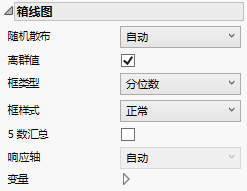 显示离群值或分位数箱线图。箱线图提供值分布的紧凑视图。当变量的数据类型为“数值”时,箱线图元素很有用。有关离群值和分位数箱线图的详细信息,请参见