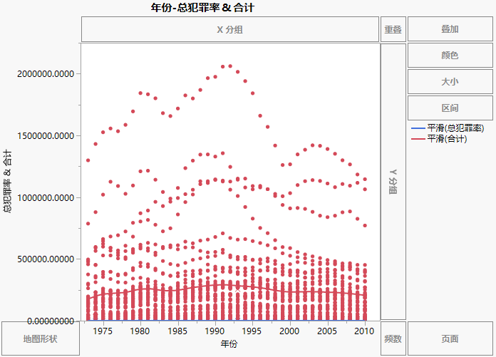 在右侧添加针对总犯罪率的轴,并且各轴重新统一尺度以同时显示两组值。您现在可以看到两个测度之间的关系。例如,两个测度都开始在 1991 年下降。