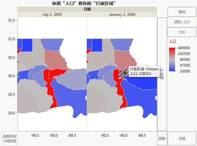 地图文件一经设置即可使用。Katrina.jmp 数据表包含按行政区域划分的卡特里娜飓风影响的相关数据。您想要直观地查看卡特里娜飓风过后各行政区域人口有何变化。请按以下步骤操作: