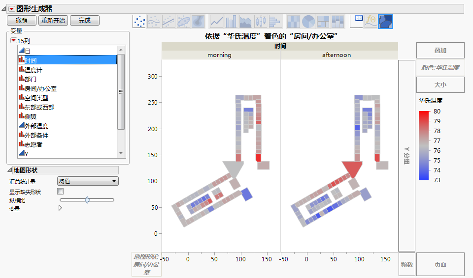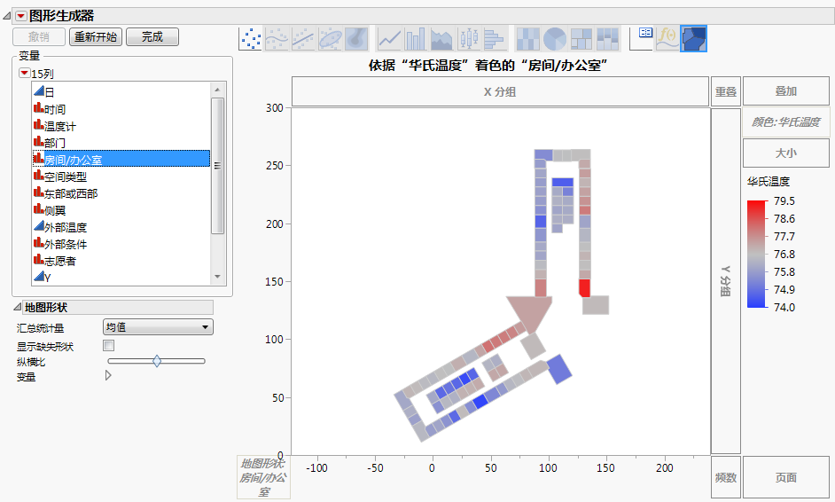 该示例展示了创建定制背景地图进行办公室温度研究,以及如何使用 JMP 展示结果。示例中收集了某一建筑物楼层内各办公室温度的数据。使用“JMP 文件交换库”(https://community.jmp.com/docs/DOC-6218) 中的 Custom Map Creator 插件创建了楼层的地图。使用“图形生成器”,办公室温度结果随后会得到直观地分析。