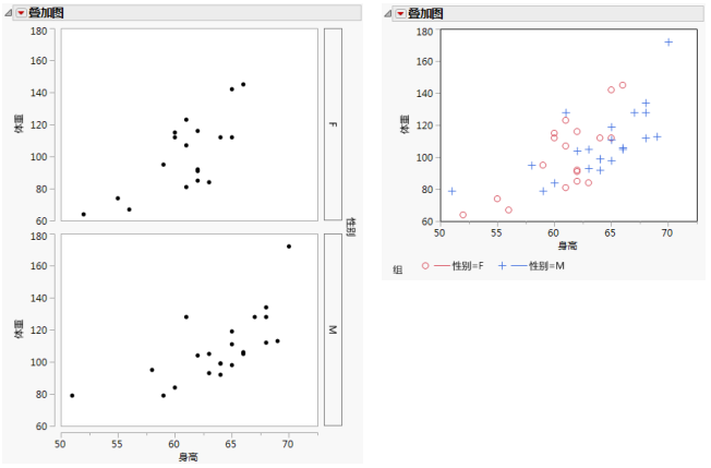 图 5.6显示了叠加组选项对包含一个 Y 变量、一个 X 变量和一个分组变量的叠加图的影响。分组变量包含两个水平。左图禁用了叠加组,所以为该分组变量的两个水平生成了单独的图形。右图启用了叠加组,所以只有一个图形,其中使用颜色和标记来显示该分组变量的两个水平。图形下方添加了说明各水平的图例。