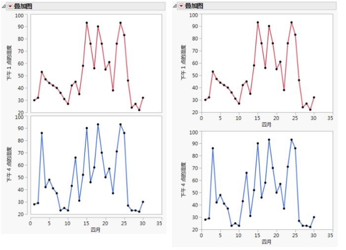 图 5.7显示了单独轴选项对包含两个 Y 变量和一个 X 变量的叠加图的影响。禁用了叠加 Y 值选项,所以为每个 Y 变量生成了单独的图。左图禁用了单独轴,所以两个图形共享同一个 x 轴。右图启用了单独轴,所以两个图形有各自的 x 轴。