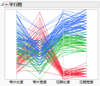 使用平行图,您可以直观表示数据表中的各个单元格。在平行图中绘制表示数据表中各行的相连线段。平行图最初由 Inselberg (