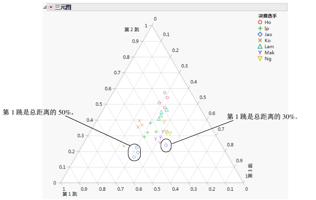该示例使用 Pogo Jumps.jmp 样本数据表。该数据改编自 Aitchison (1986),显示 1985 年香港弹簧跳远锦标赛中 7 位决赛选手的弹簧跳远成绩。单次弹簧跳远成绩为三次连续弹跳中总的跳远距离,被称为第 1 跳、第 2 跳和第 3 跳。