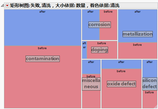 该示例使用 Failure3.jmp 样本数据表,其中包含在集成电路制作过程中失败的常见原因。检查失败原因和发生时间。