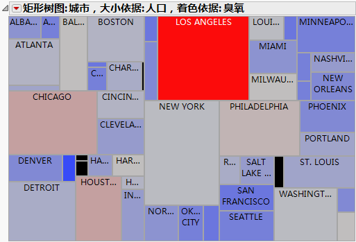 矩形树图对于观测有很多水平的组中的模式很有用。矩形树图好像是在两个维度中折叠的条形图使得不存在未使用的空间。并非为每个测量绘制一个直条,矩形树图可以通过改变矩形区域的大小或颜色来显示测量的大小。当您的数据包含很多类别时,可以使用矩形树图来直观表示很多组。
