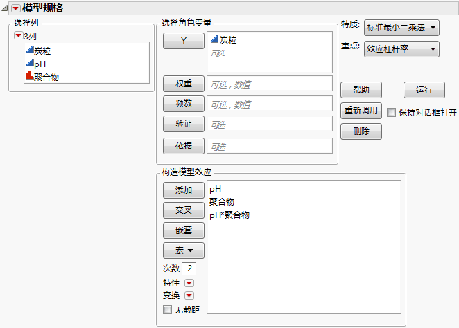 打开 Cleansing.jmp。您关注的是三种聚合物(聚合物)中是否有任何聚合物影响清除炭粒(炭粒)。油箱 pH 作为协变量包括在内,因为它可能影响聚合物清洗油箱的能力。针对三种聚合物类型对 pH 和炭粒之间的关系建模时,您允许存在可能不同的斜率。