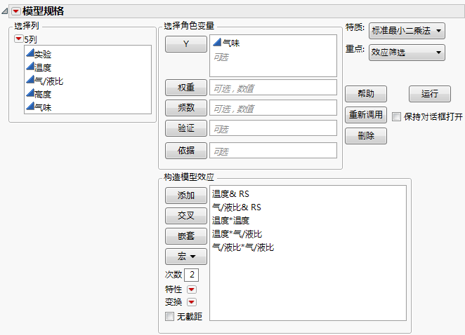 打开 Odor Control Original.jmp 样本数据表。您想要拟合响应曲面,以便对作为温度和气/液比的函数的响应气味建模。(您可以包括高度,如数据表脚本响应曲面所示,但在此演示中请不要包括。)