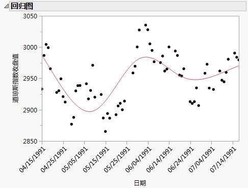 图 2.22显示了针对 XYZ Stock Averages (plots).jmp 样本数据表中数据的模型拟合的“回归图”。在此,向日期分配了“纽结样条效应”并指定了五个结点。道琼斯指数收盘值是响应。