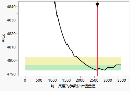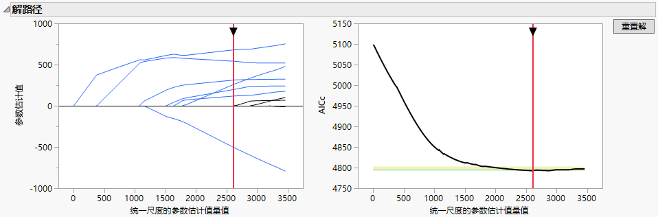两个图中的红色垂直实线都对应同一个 l1 范数值,该值是“原始预测变量的参数估计值”报表中显示的解的值。您可以在任意一个图中拖动红色垂直线顶部的箭头来更改罚值的大小,以指示新的当前模型。在验证图中,您还可以点击图中的任意位置来更改模型。拖动红色的垂直线指示新模型时,报表中的结果将相应更新以反映当前选择的模型。垂直虚线仍在最佳拟合模型处。您可以点击“验证图”旁边的重置解按钮,返回初始解的垂直红线和相应结果。对于某些验证方法,验证图提供用于标识可比模型的区域。请参见可比模型区域。
