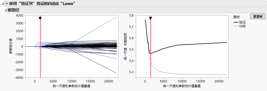 随即显示“使用‘验证列’验证的自适应‘Lasso’”报表。“解路径”报表(图 6.2)显示参数估计值图和统一尺度的负对数似然图。当统一尺度的参数估计值量值减小时收缩量增加。图最右侧的估计值是最大似然估计值。红色的垂直线指示验证准则选择的那些参数值,在该示例中的保留样本由验证列定义。