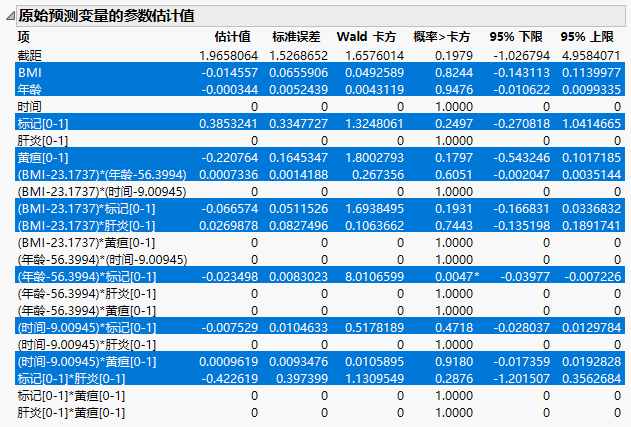“原始预测变量的参数估计值”报表(图 7.2)显示非中心化和未统一尺度的数据的参数估计值。突出显示具有非零参数估计值的 11 项。其中包括交互作用效应。在数据表中,选择全部 6 个预测变量列,因为每个预测变量列显示在具有非零系数的项中。