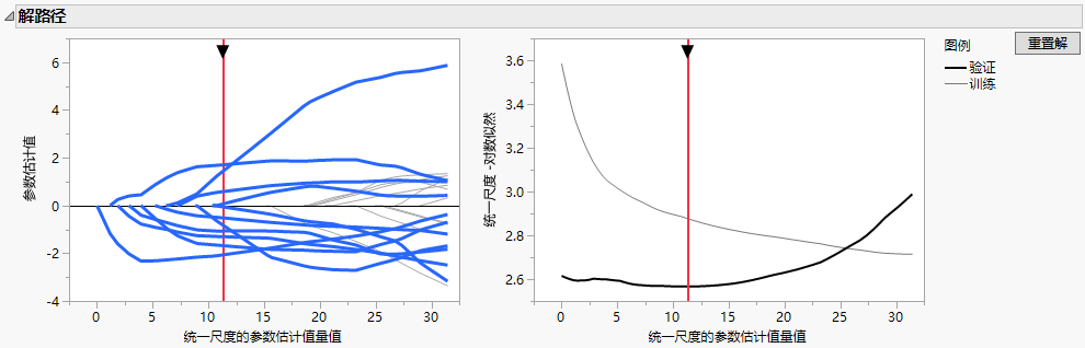 图 7.1 突出显示了非零项的 Lasso 拟合的解路径