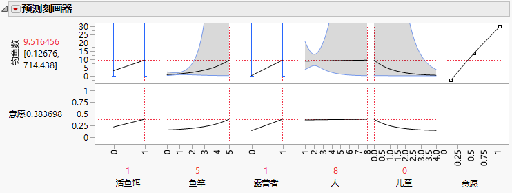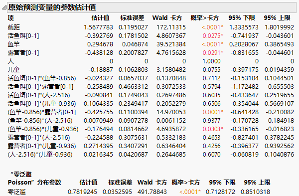 Fishing.jmp 样本数据表包含虚拟数据,用于研究哪些因素会影响成组游客在公园里钓到的鱼的数目。该数据表包含结伴而来的家庭或团体的 250 个响应。本例将钓鱼数建模为活鱼饵、鱼竿、露营者、人和儿童的函数。数据表的“列注释”中对这些列进行了说明。