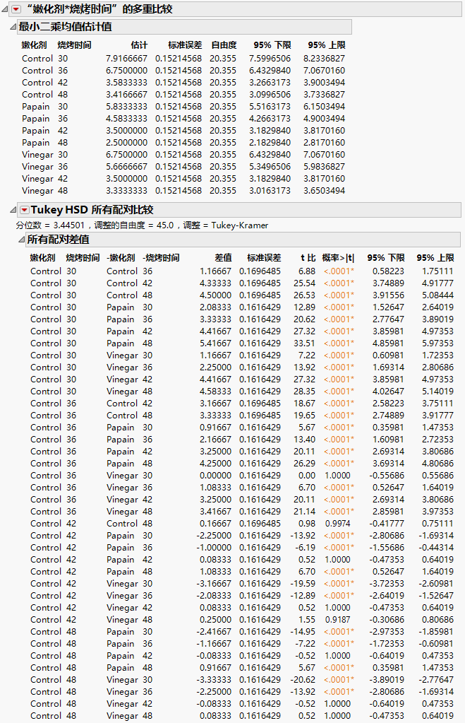 图 8.31显示配对比较列表的部分内容。在刻画器中观测到的“papain”和“vinegar”之间的大多数差异在统计上是显著的。因此,“papain”似乎是更好的嫩化剂。