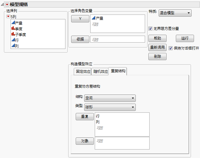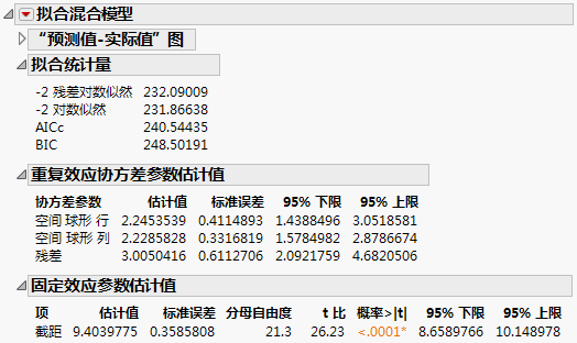 “拟合混合模型”报表显示在图 8.36中。拟合统计量指示该模型的拟合效果没有各向同性(空间结构)球形模型的拟合效果好(AICc 240.54 对比 234.08)。“重复效应协方差参数估计值”报表显示“行”(空间球体行)和“列”(空间球体列)协方差的估计值很接近。没有证据表明网格的行内和列内的空间相关性存在差异。