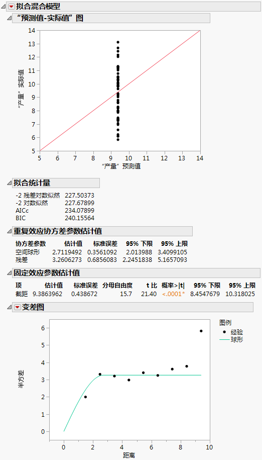 “拟合混合模型”报表显示在图 8.33中。“预测值-实际值”图显示预测产量为单个值。这是因为只拟合了空间协方差。“拟合统计量”报表显示“-2 对数似然”为 227.68,“AICc”为 234.08。