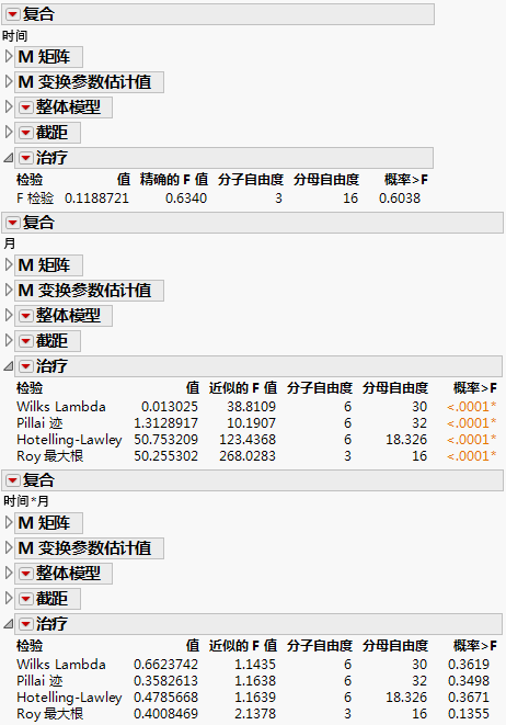 “时间”报表显示“时间”与治疗之间的交互作用的 p 值为 0.6038,这指示交互作用不显著。这意味着没有证据表明“上午”和“下午”的治疗之间存在差异。因为“时间”有两个水平(“上午”和“下午”),所以将显示精确的 F 检验。