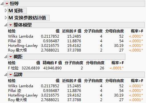 M 矩阵报表提供您指定的响应设计。M 变换参数估计值报表提供原始参数估计值矩阵与 M 矩阵的转置矩阵之积。