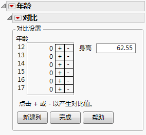 每次您点击 + 或 - 按钮时,对比系数都进行标准化,尽可能使其总和为 0 且其绝对值总和等于 2。要比较其他水平,请点击新建列按钮。随即显示一个新列,您可以在其中定义新对比。完成操作后,点击完成。“对比”报表随即显示(图 3.15)。总体检验是一个针对所有对比的联合 F 检验。