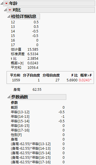 “对比”报表显示在图 3.15中。对比检验在 0.05 水平下显著。您可以得出结论:身高均值为 62.55 时,年龄为 12 岁和 13 岁的少年的体重预测值在统计上与年龄为 14 岁和 15 岁的少年的体重预测值存在差异。