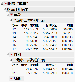 由于最小二乘均值是其他模型因子的特定值处的预测,所以您可以比较它们。检验效应时,将使用最小二乘均值进行比较。有关最小二乘均值的更多详细信息,请参见名义型因子的最小二乘均值和第 449 页的“有序型最小二乘均值”。