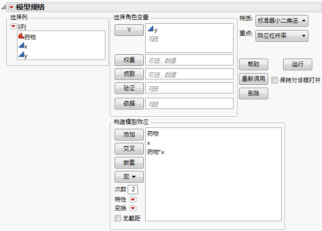 您想要确定三个药物组之间是否有差异。使用响应 y、模型效应药物和 x,以及药物与 x 之间的交互作用来构造模型。该交互作用或许能解释各种药物因病程而异导致不同效应的情形。(有关“拟合模型”窗口和各种特质的背景信息,请参见第 15 页的“模型规格”一章。)