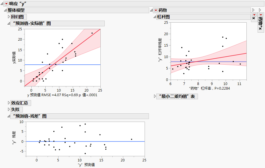 “拟合最小二乘法”报表显示在图 3.3中。请注意,由于空间有限,其中的有些报告已关闭。“预测值-实际值”图、“预测值-残差”图和杠杆图在模型拟合和基本假设方面未显示任何差异。