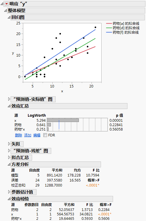 尽管“回归图”表明药物与治疗前测量 x 交互,但“效应检验”报表中的“概率>F”值不支持该结论。“效应检验”报表还显示 x 在解释 y 时显著,但药物不显著。该研究未检测到三个组之间的差异。不过,您不能推断出药物无效果的结论。各种药物可能有不同效果,但该研究规模不足以检测出这种差异。