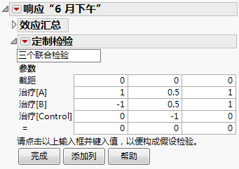 点击“完成”按钮可执行检验。报表随即更改,以便为每个检验列显示检验统计量值、标准误差和其他统计量。针对所有列的联合 F 检验在报表底部的框中提供。