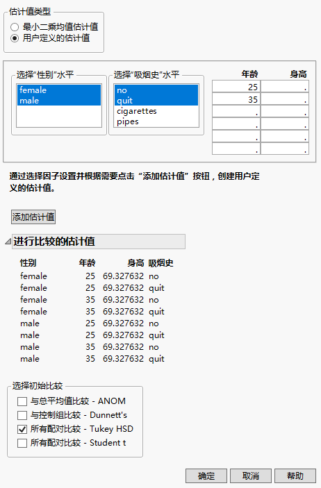 图 3.29对如何指定“用户定义的估计值”进行了演示。已选定“年龄”的三个水平和“性别”的两个水平。此外,还手动输入了“身高”的两个值。已点击“添加估计值”按钮,生成了指定水平的所有可能组合的列表。此时,您可以指定更多估计值,并通过再次点击“估计值”按钮将其添加至“估计值进行比较”列表。