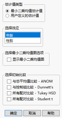 该选项比较最小二乘均值,仅在模型中有名义型或有序型效应时才可用。回想一下,最小二乘均值是在模型中其他效应设置为某个中性值时计算的均值。(有关最小二乘均值的定义,请参见最小二乘均值表。)您必须选择相关的效应。在图 3.28中,为年龄指定了“最小二乘均值估计值”。提供显示最小二乘均值图的选项。请参见最小二乘均值图选项。